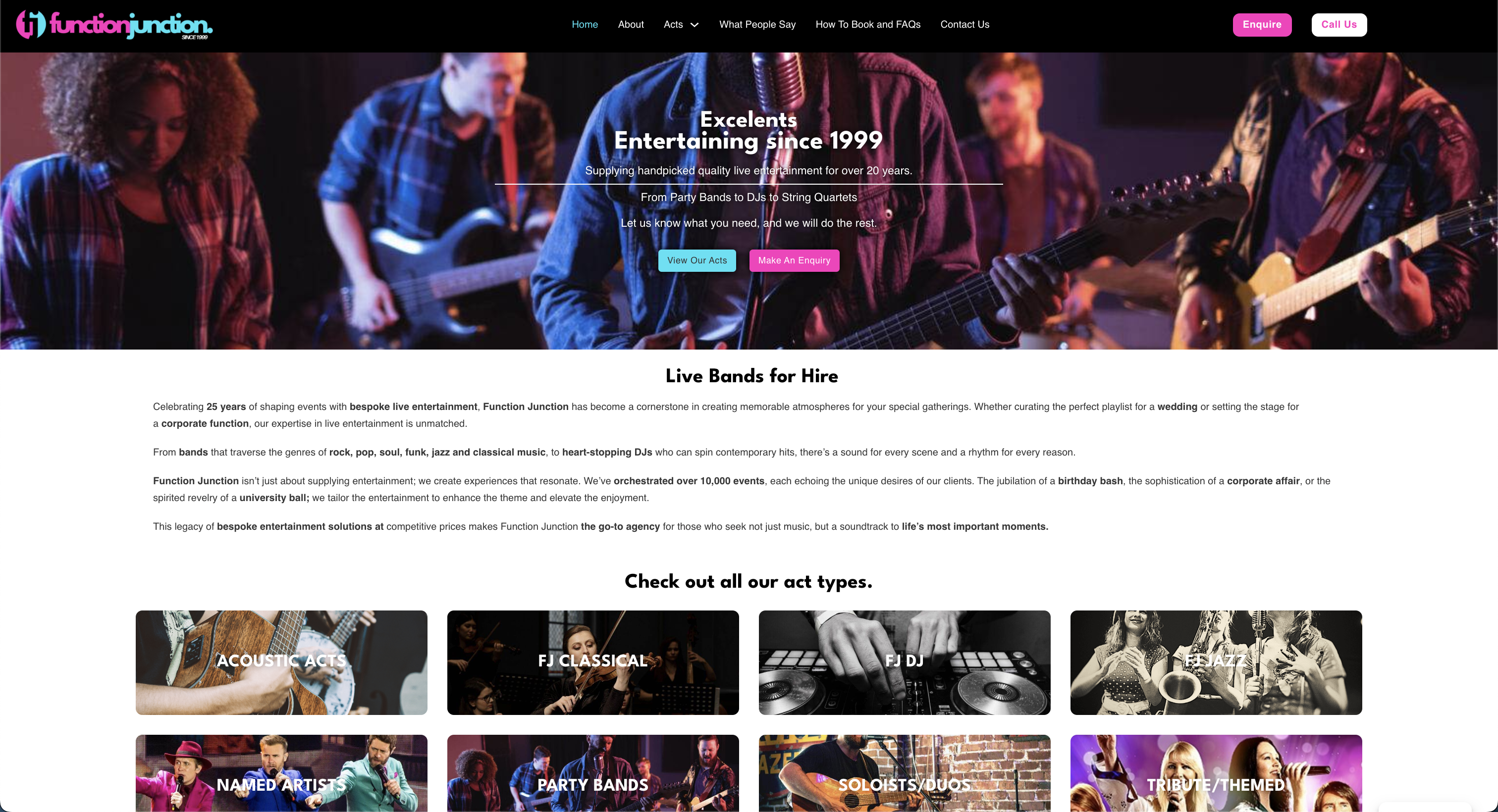 I designed and developed this comprehensive website for Function Junction, an established entertainment agency specializing in live bands and performers for events. The site features a striking dark-themed design with vibrant pink and blue branding elements that create visual impact while maintaining professionalism. The clean, intuitive navigation system guides users through the various sections, from browsing different act categories to making enquiries.
